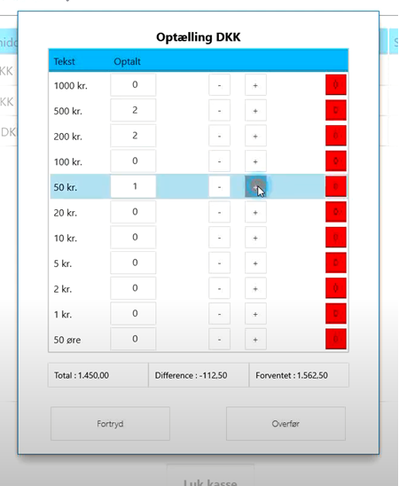 Med denne funktion optælles mønter og sedler med det antal, der er i kassen,